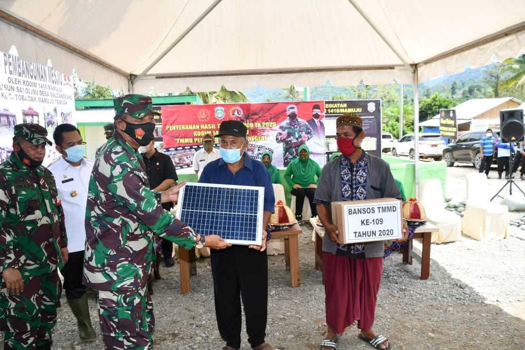 Penandatanganan dan penyerahan hasil pekerjaan Satgas TMMD 109 di Dusun Salolisu Desa Salundeang, Kecamatan Tobadak, Kabupaten Mamuju Tengah, Sulawesi Barat (Sulbar) berlangsung di lokasi TMMD dalam nuansa yang sangat sederhana dengan mengikuti protokol Kesehatan Covid-19, Rabu (21/10/2020).