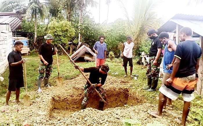 Sebagai wujud kepedulian dan empati serta duka cita yang mendalam terhadap musibah yang dialami salah satu warga di perbatasan, Pos Km.140 Satgas Pamtas Yonif 312 Kala Hitam membantu menyiapkan pemakaman mendiang Ibu Dedimah Atiape (45), di Kampung Monggoefi, Distrik Yafi, Kabupaten Keerom, Papua, Sabtu (24/10/2020).