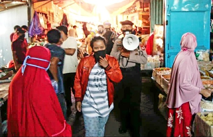 Meski hari libur, personel Polres Pelabuhan Makassar yang terlibat dalam Operasi Aman Nusa II atau Operasi Yustisi tetap mengecek penerapan protokol kesehatan di pusat perbelanjaan Pasar Butung dan Makassar Mall, Kamis (29/10/2020).