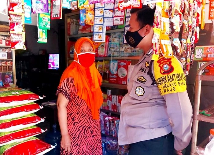 Dukung Operasi Yustisi dan sosialisasikan Adaptasi Kebiasaan Baru, Bhabinkamtibmas Kelurahan Melayu Baru Bripka Hartawan lakukan blusukan keluar masuk pasar, dimana pasar adalah tempat berkumpulnya berbagai macam transaksi ekonomi yang sangat rentan penularan virus Corona atau Covid-19, Senin (02/11/2020).