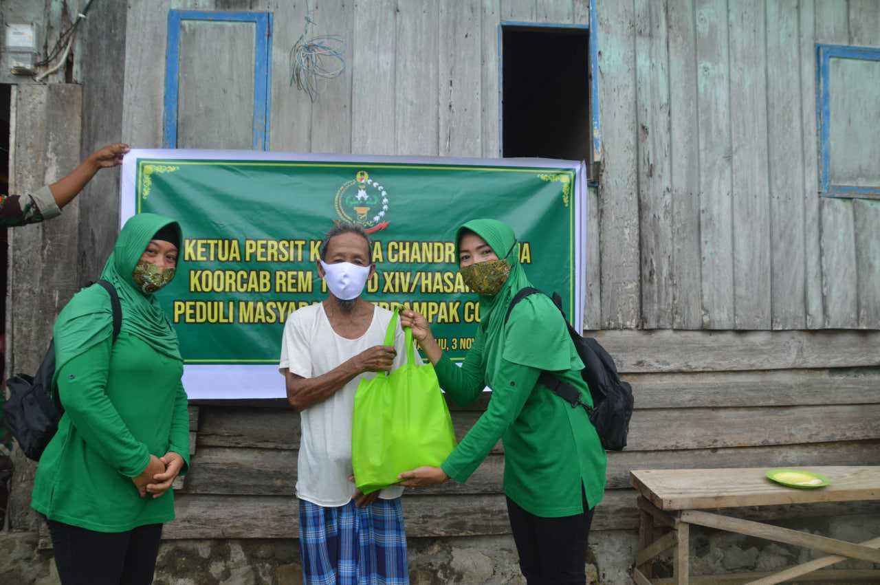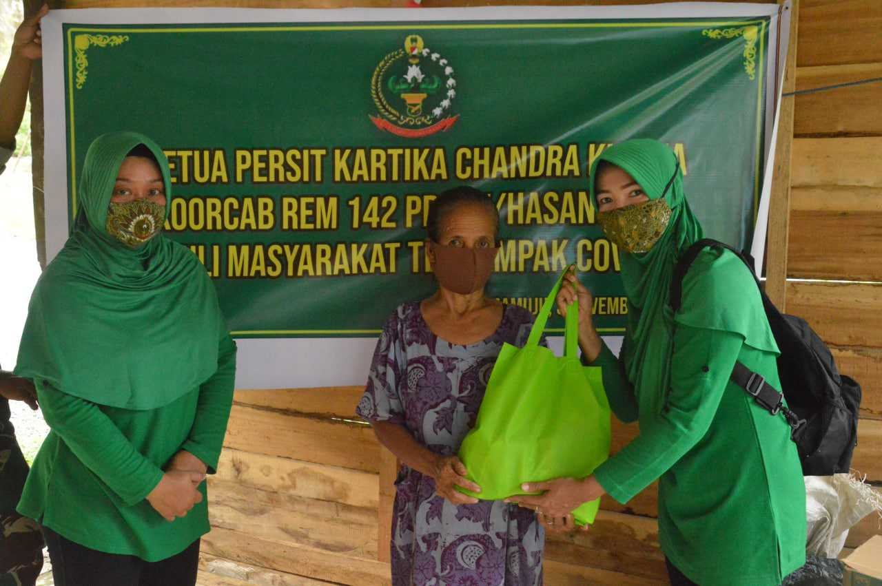 Dalam rangka peduli masyarakat Covid-19, Persit KCK Koorcabrem 142 menyerahkan bantuan sembako kepada warga di sekitar Desa Sumare, Mamuju, Provinsi Sulawesi Barat (Sulbar), Selasa (3/11/2020).