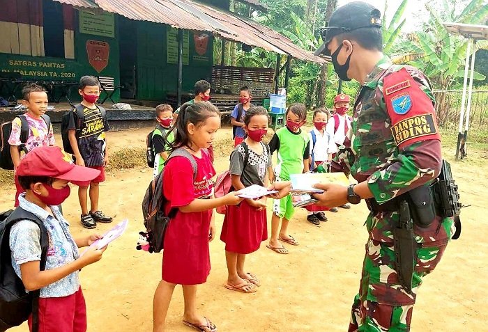 Setelah memberikan bendera tersebut, anggota Satgas kemudian pergi ke SDN 1 Siding untuk membagikan perlengkapan sekolah berupa buku dan alat tulis.