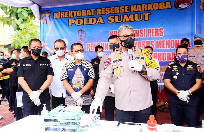 “Secara pribadi saya meminta tolong kepada rekan media dan masyarakat bahwa sekarang Sumut bukan lagi tempat persinggahan namun sudah menjadi pasar pengedaran narkotika, maka dari itu media harus mengedukasi masyarakat agar mau melapor ke BNN atau ke Narkoba Polda Sumut agar segera di lakukan penindakan untuk melindungi generasi muda Sumut,” ucap orang nomor satu di Polda Sumut.
