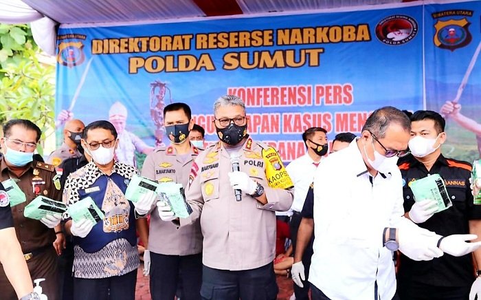 Kapolda Sumut memimpin pengungkapan 2 (dua) kasus penyalahgunaan narkotika jaringan Aceh - Sumut dan jaringan Aceh - Sumut - Jambi yang berhasil diungkap oleh Direktorat Narkotika Polda Sumut bulan November 2020 bertempat di Lapangan Direktorat Narkotika Polda Sumut, Rabu (11/11/2020) pagi pukul 10.00 WIB.