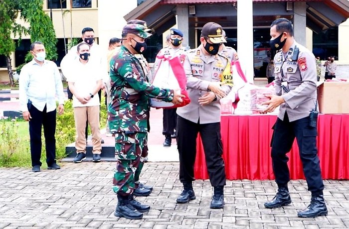 Kapolda langsung menyerahkan bantuan sosial tersebut secara simbolis melalui para Kapolsek dan Danramil se-Kota Makassar yang selanjutnya akan dibagikan kepada masyarakat Kota Makassar.