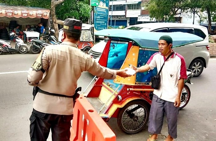 Personel Polsek Bontoala membagi-bagikan makanan kepada pengemudi bentor dan tukang becak.