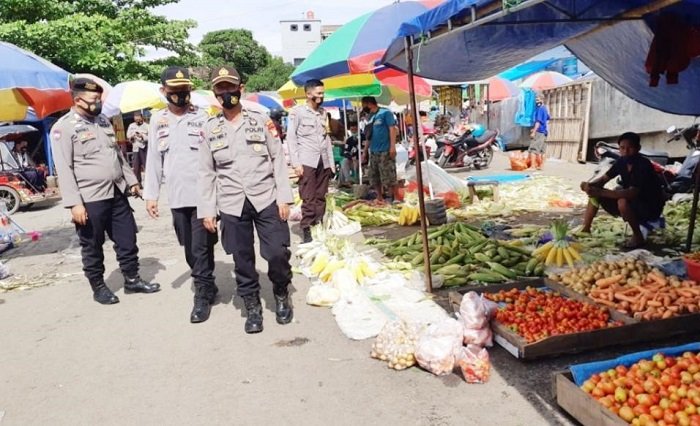 Guna menekan dan memutus mata rantai penyebaran Covid-19, Kapolsek Somba Opu Polres Gowa Kompol Jamaluddin turun langsung ke pasar bersama personelnya.