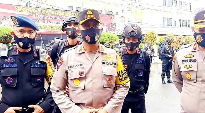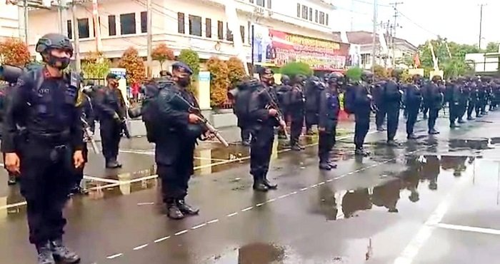 Pasukan Polri ini datang dengan membawa segala perlengkapan pengamanan baik berupa senjata api maupun peralatan anti huru hara.