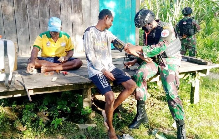 Berbagi kasih tidak harus dengan bentuk barang ataupun uang tetapi juga melalui pelayanan kesehatan yang dilaksanakan Satgas Yonif Raider 100/PS Pos Wambes di akhir tahun 2020 untuk memberikan pelayanan kesehatan gratis dengan berkeliling Kampung Wambes, Distrik Arso Timur, Kabupaten Keerom, Provinsi Papua, Kamis (03/12/2020).