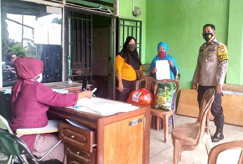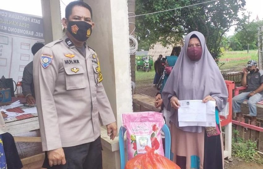 Nampak Bhabinkamtibmas Aiptu Muh Nur membantu menyalurkan sembako namun tetap sesuai prosedur protokol kesehatan dengan mewajibkan memakai masker dan tetap jaga jarak atau physical distancing warganya.