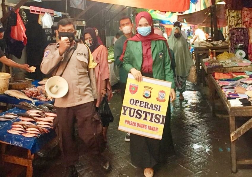 Bhabinkamtibmas Tabaringan Aiptu Syamsuddin bersama dengan mahasiswa Fakultas Hukum Universitas Muslim Indonesia (UMI) Makassar menggelar kegiatan pendisiplinan protokol kesehatan kepada para pedagang dan pengunjung Pasar Cidu, Kecamatan Ujung Tanah, Kota Makassar, Jumat (04/12/2020).