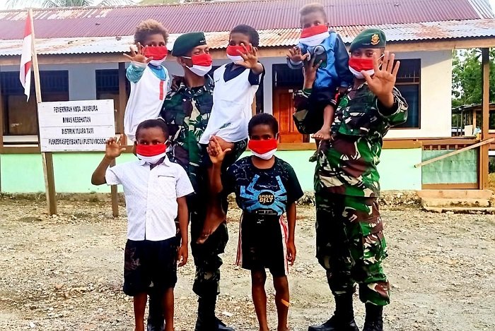 Menyambut bulan Desember, bulan yang penuh kasih bagi umat Nasrani, Satgas Pamtas RI-PNG Yonif Mekanis Raider (MR) 413 Kostrad membagikan masker dan kaos kepada anak perbatasan RI-PNG di Kampung Mosso, Distrik Muara Tami, Kota Jayapura.