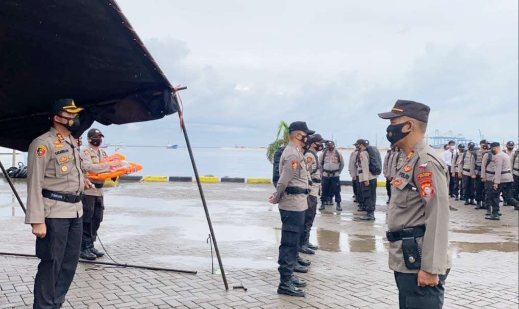 Polres Pelabuhan Makassar melaksanakan apel pergeseran pasukan pengamanan TPS di dermaga Pelabuhan Paotere, Minggu (06/12/2020).