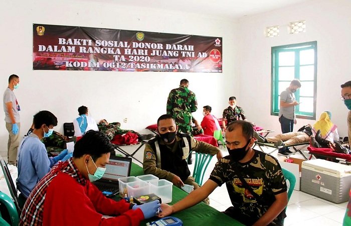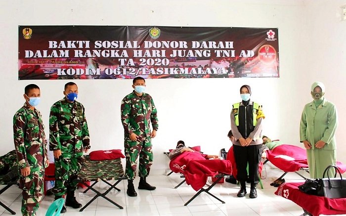 Kodim 0612 Tasikmalaya menggelar kegiatan donor darah dalam rangka memperingati Hari Juang Kartika Tahun 2020, yang berlangsung di Makodim 0612 Tasikmalaya, Jumat (11/12/2020).
