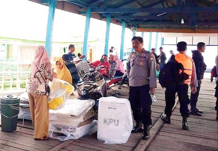 Personel Polres Pelabuhan Makassar yang bertugas mengamankan tempat pemungutan suara (TPS) di Kepulauan Sangkarrang, kali ini mengawal kembali kertas suara ke Kantor PPK.