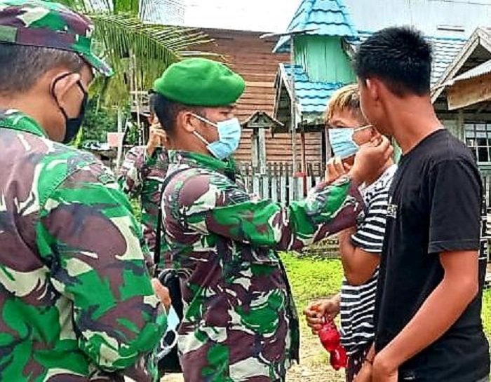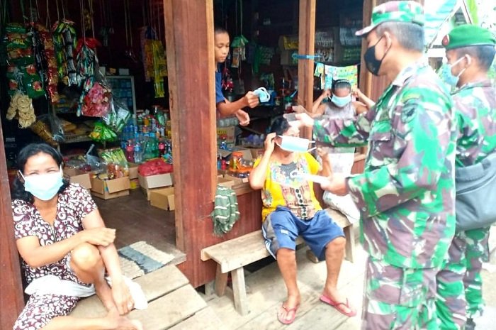 Menghadang laju penyebaran virus Corona (Covid-19), Koramil 1012-11/Pendang membagikan masker gratis serta memberikan imbauan kepada masyarakat di Desa Gunung Rantau, Kecamatan Dusun Utara, Kabupaten Barito Selatan.