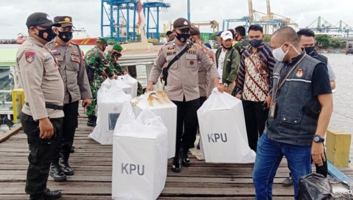 Polres Pelabuhan Makassar dipimpin Kabag Ops Kompol Gani mengawal surat suara Pemilihan Walikota dan Wakil Walikota Makassar guna keamanan dan kelancaran pergeseran surat suara dan kotak suara Pilkada Serentak 2020.