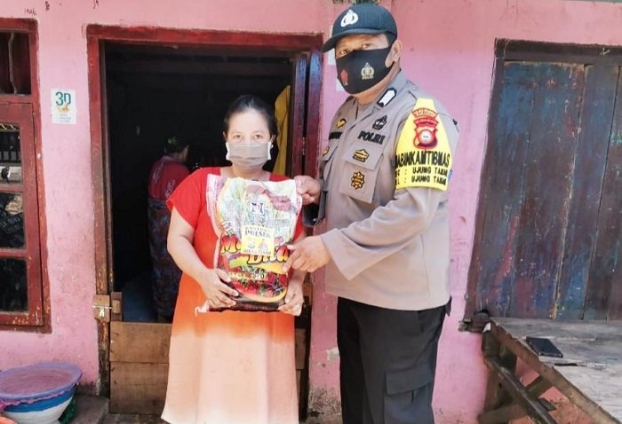 Dalam membantu warganya yang kurang mampu dan terdampak pandemi Covid-19, Bhabinkamtibmas Kelurahan Ujung Tanah Bripkan Edwin mengantarkan langsung paket sembako berupa beras dari Polri.