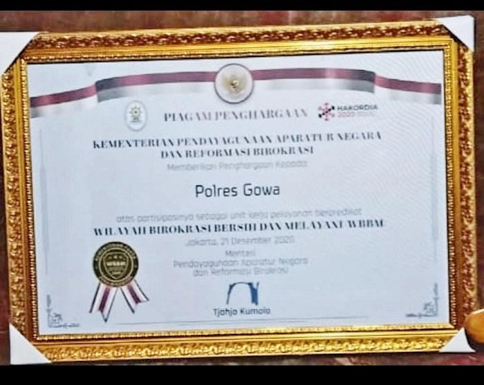 Penghargaan yang diserahkan langsung oleh Menteri Pendayagunaan Aparatur Negara dan Reformasi Birokrasi (Menpan RB) Thahjo Kumolo, SH dan diberikan kepada 752 Unit kerja termasuk Polres Gowa sebagai penerima penghargaan Zona Integritas Wilayah Birokrasi Bersih Melayani.