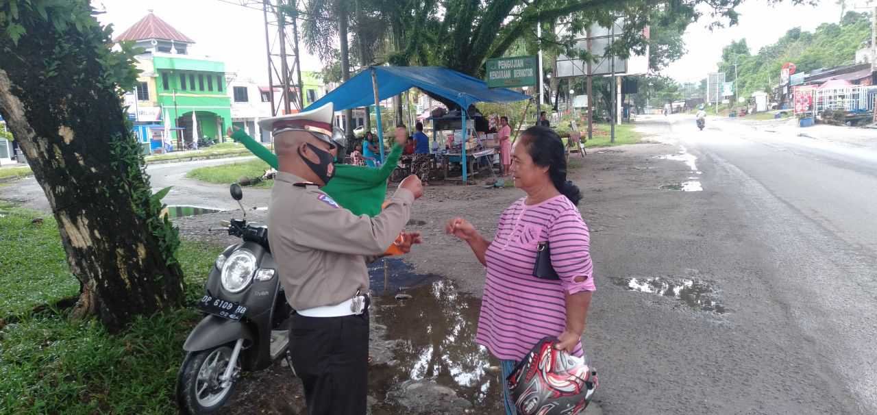 “Bagi-bagi masker kepada pengguna jalan yang tertib dan disiplin protokol kesehatan (Prokes),” jelas KBO Lantas Polres Lutra.