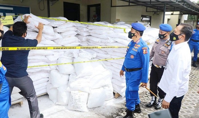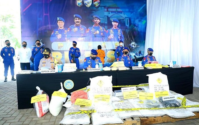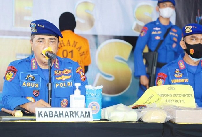 Kepala Badan Pemelihara Keamanan (Kabaharkam) Polri, Komjen Pol Agus Andrianto, pimpin kegiatan press release pengungkapan kasus tindak pidana bahan peledak berupa perakitan 16,375 ton bom ikan, bertempat di Mako Dit Polairud Polda Jawa Timur, Senin, 28 Desember 2020.