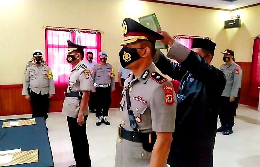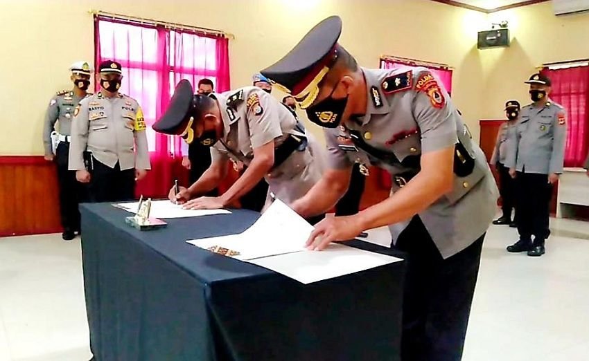 Perwira Polres Gowa melaksanakan upacara serah terima jabatan di Aula Endra Dharmalaksana, Selasa (29/12/2020).