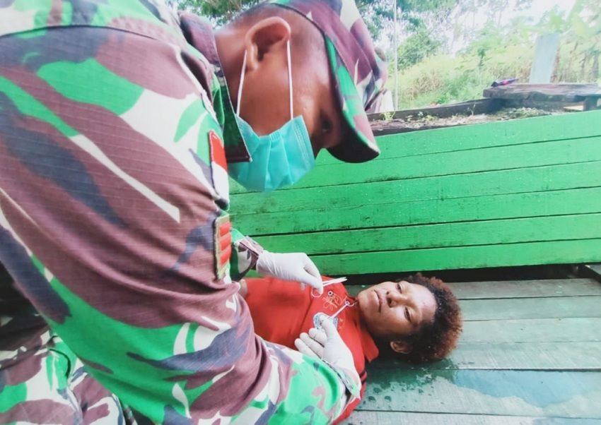 Satgas Pamtas RI-PNG Yonif Raider 100/PS Pos Waris bertindak cepat dalam menangani kesulitan khususnya di bidang kesehatan apabila ada masyarakat dalam keadaan darurat, dimana kita ketahui bersama tenaga medis dan sarana prasarana kesehatannya yang masih terbatas di perbatasan RI-PNG, salah satunya Pos Waris yang memberikan pelayanan kesehatan di Kampung Banda, Distrik Waris, Kabupaten Keerom, Provinsi Papua, Kamis (31/12/2020).