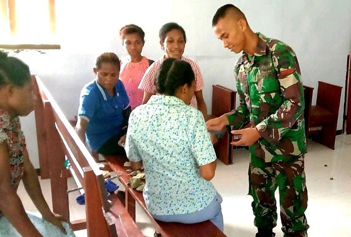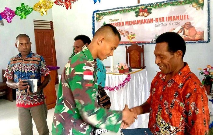 Suasana hari Minggu di awal tahun baru 2021 membuat Pos Ampas Satgas Yonif Raider 100/PS tergerak dalam memberikan motivasi dalam beribadah, salah satunya dengan menyumbangkan sejumlah Buku Alkitab dan Buku Rohani kepada jemaat di Gereja Santo Petrus, Kampung Ampas, Distrik Waris, Kabupaten Keerom, Provinsi Papua, Minggu (03/01/2021).