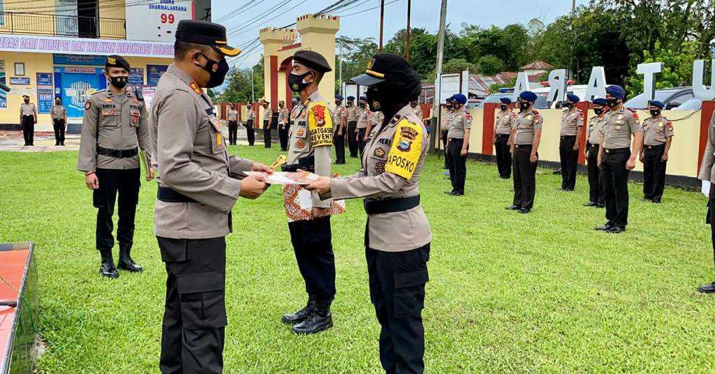 Kepala Polisi Resort (Kapolres) Luwu Utara (Lutra) Polda Sulawesi Selatan (Sulsel), AKBP Irwan Sunuddin memimpin langsung upacara laporan kenaikan pangkat periode 01 Januari 2021 di Lapangan Apel Mako Polres Lutra, Senin (4/1/2021).