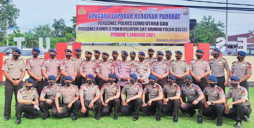 Sebanyak 30 personel Kompi 3 YON B Pelopor Brimob Baebunta Polda Sulawesi Selatan (Sulsel) resmi naik pangkat, Senin (4/1/2020).