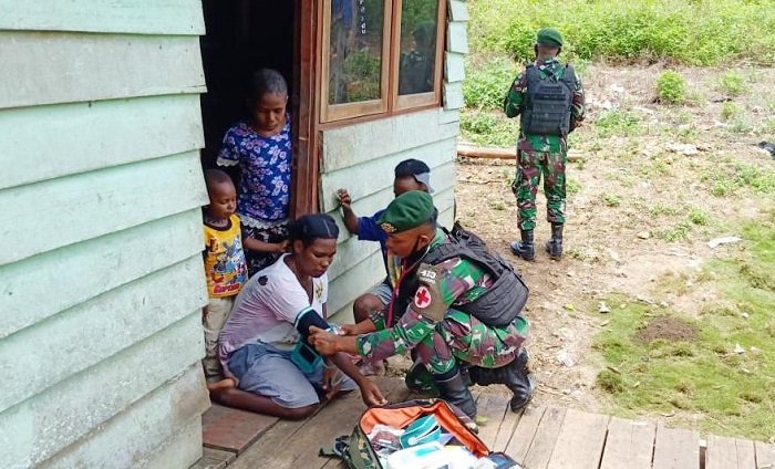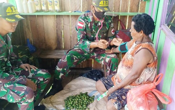 Dalam upaya menjamin kualitas kesehatan masyarakat Perbatasan, Satgas Pamtas RI-PNG Yonif Mekanis Raider (MR) 413 Kostrad Pos Bendungan Tami menggelar kegiatan bhakti sosial pengobatan keliling di Kampung Gambut, Distrik Muara Tami, Kota Jayapura.