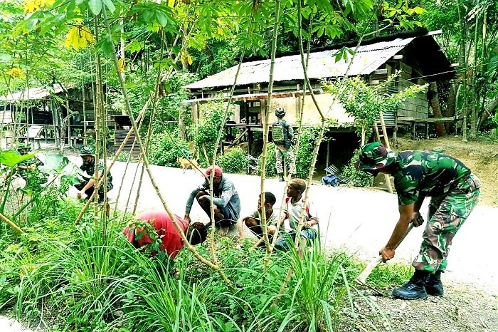 Dalam upaya menjaga kualitas kebersihan kampung, Satgas Pamtas RI-PNG Yonif Raider 100/PS Pos Karang bersama masyarakat melakukan karya bhakti membersihkan lingkungan sekitar Kampung Yuwainda, Distrik Waris, Kabupaten Keerom, Provinsi Papua, Sabtu (16/01/2021).
