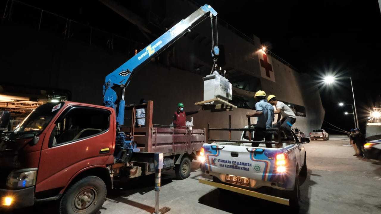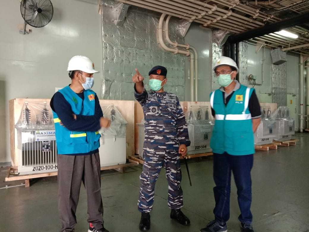 Sebanyak 33 unit trafo dan 20 tiang besi tambahan milik PLN tiba di Pelabuhan Pangkalan TNI Angkatan Laut (Lanal) Mamuju, Senin (18/1/2021) malam, setelah diangkut dari Surabaya menggunakan Kapal Rumah Sakit KRI dr. Soeharso-990.