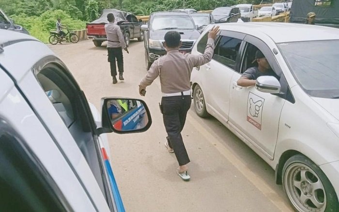 Dua personel Polres Gowa dari Satuan Lalu Lintas Bripka Akbar bersama Kasubnit 2 Turjawali Sat Sabhara Aiptu Rahman Karim dengan sigap turun langsung mengurai kemacetan di Jalan Trans Sulawesi.