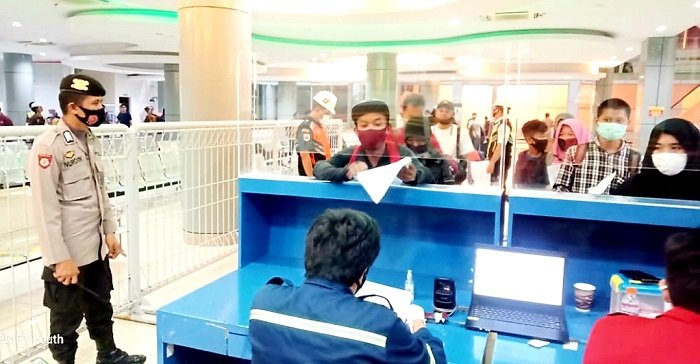 Gelar Operasi Yustisi ditengah pandemi Covid-19, Polres Pelabuhan Makassar mengawasi dan memberikan edukasi protokol kesehatan kepada penumpang maupun pekerja di Pelabuhan Soekarno-Hatta Makassar, Rabu (20/01/2021).