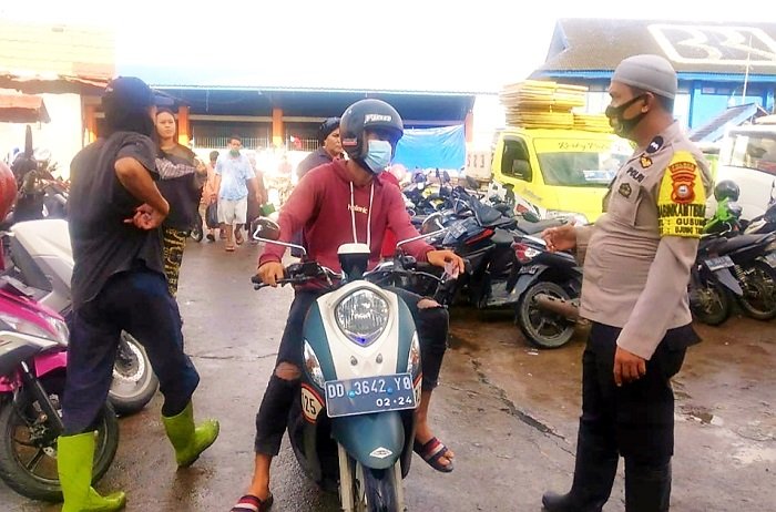 Kali ini, Bhabinkamtibmas Kelurahan Gusung, Kecamatan Ujung Tanah, Kota Makassar, Aipda Naharuddin melakukan pengawasan terhadap penerapan protokol kesehatan di Tempat Pelelangan Ikan (TPI) Paotere.