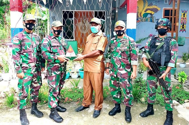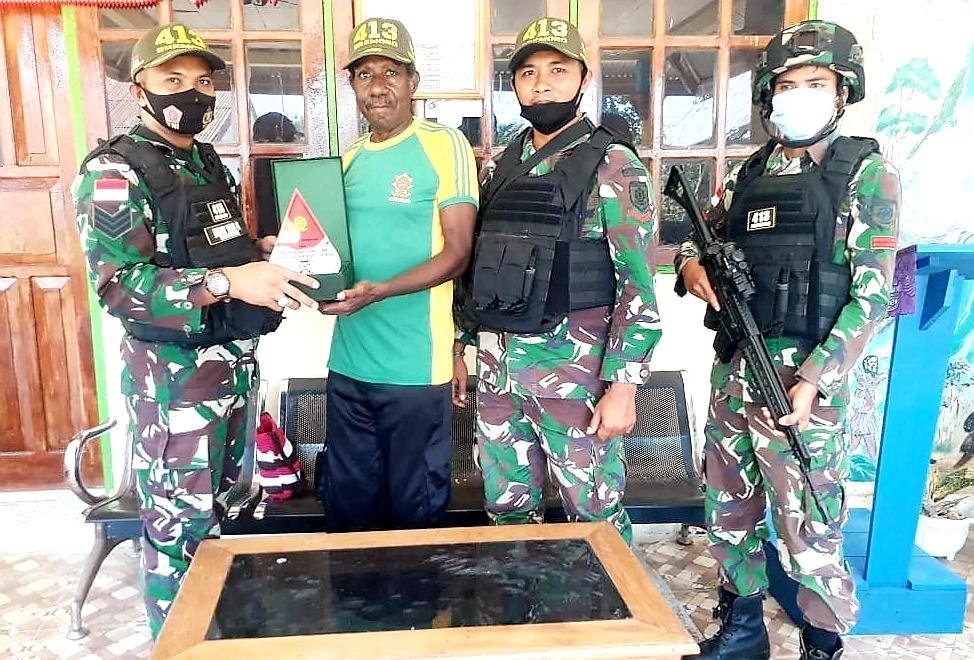 Menjelang purna Tugas Operasi Pengamanan Perbatasan di Sektor Utara Papua, Satgas Pamtas RI-PNG Yonif Mekanis Raider (MR) 413 Kostrad Pos Koya Koso memberikan cinderamata berupa topi dan plakat kepada masyarakat di Kampung Koya Koso, Distrik Abepura, Kota Jayapura.