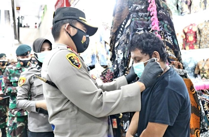 Kapolres Pelabuhan Makassar AKBP Muhammad Kadarislam Kasim, SH, SIK, M.Si menyampaikan imbauan dan membagikan masker gratis kepada masyarakat di pasar tradisional yang ada di Makassar dalam rangka Operasi Yustisi.