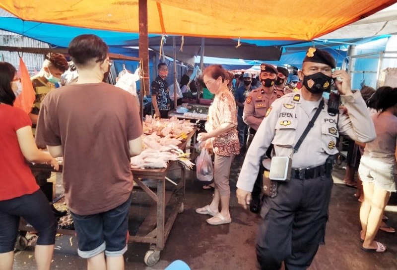 Guna meminimalisir dan mencegah penyebaran Covid-19, Polres Pelabuhan Makassar terus lakukan patroli di keramaian dalam wilayah yurisdiksinya, seperti pada Senin (15/02/2021).