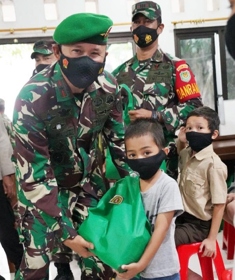 Pada kunjungannya ke Panti Asuhan Bhakti Kasih yang berada di Kp. Sindangresmi, RT 01/18, Kelurahan Bondongan, Kecamatan Bogor Selatan, Kota Bogor, Danrem juga menyerahkan bantuan sembako kepada anak-anak yatim piatu berupa 56 paket sembako, 556 masker, 56 hand sanitizer dan juga santunan untuk anak yatim piatu.