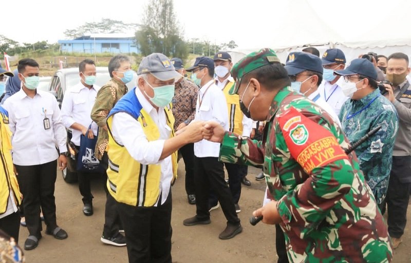 Pangdam III/Siliwangi Mayjen TNI Nugroho Budi Wiryanto bersama Gubernur Banten dan Kapolda Banten serta pejabat lainnya sambut kedatangan Presiden RI, Ir. Joko Widodo di Lapangan Bola Boru Jalan Raya Petir Serang Cilaku Kecamatan Curug, Kota Serang, Banten, Kamis (04/03/2021).