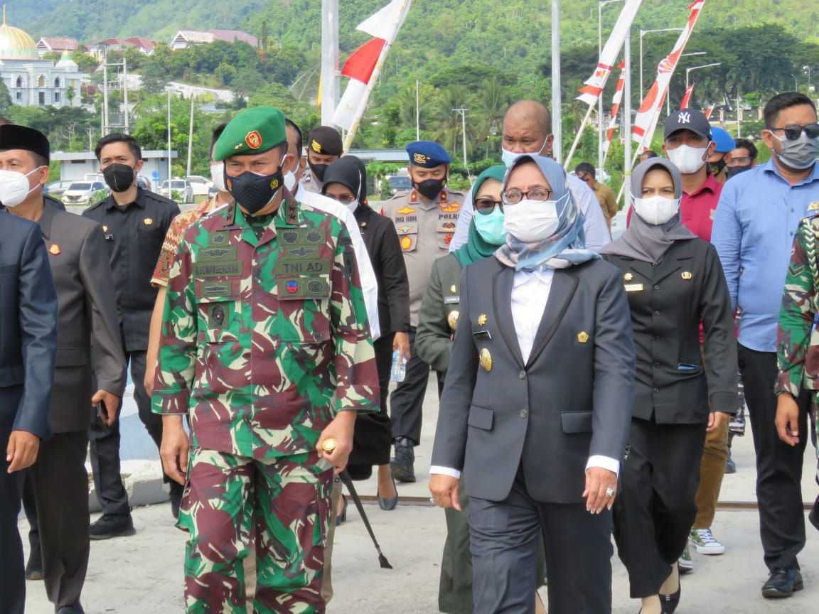 Panglima Komando Daerah Militer (Pangdam) XIV/Hasanuddin, Mayjen TNI Andi Sumangerukka, S.E memimpin upacara pelepasan Satgas Penanggulangan Bencana gempa Sulawesi Barat di Dermaga Lanal, Mamuju, Sabtu (13/3/2021).
