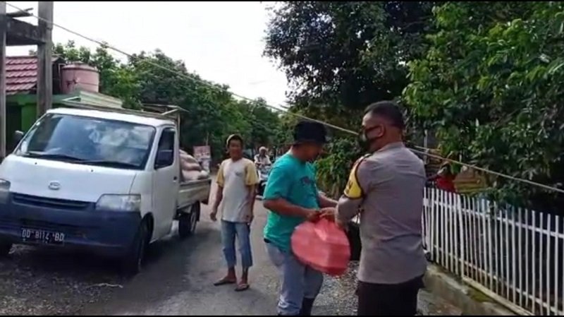 Bhabinkamtibmas Desa Pallangga dan Bungaejaya AIPTU Erwin membagikan nasi dos ke warganya yang sementara bergotongroyong membangun mesjid, minggu (21/03/21).