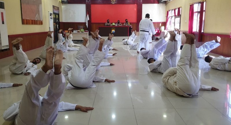 Sebanyak 61 personil Polres Gowa yang sedang diusulkan kenaikan pangkatnya periode 1 Juli 2021 mengikuti ujian beladiri UKP bertempat di Aula Endra Dharmaleksana, Senin (22/03/21).