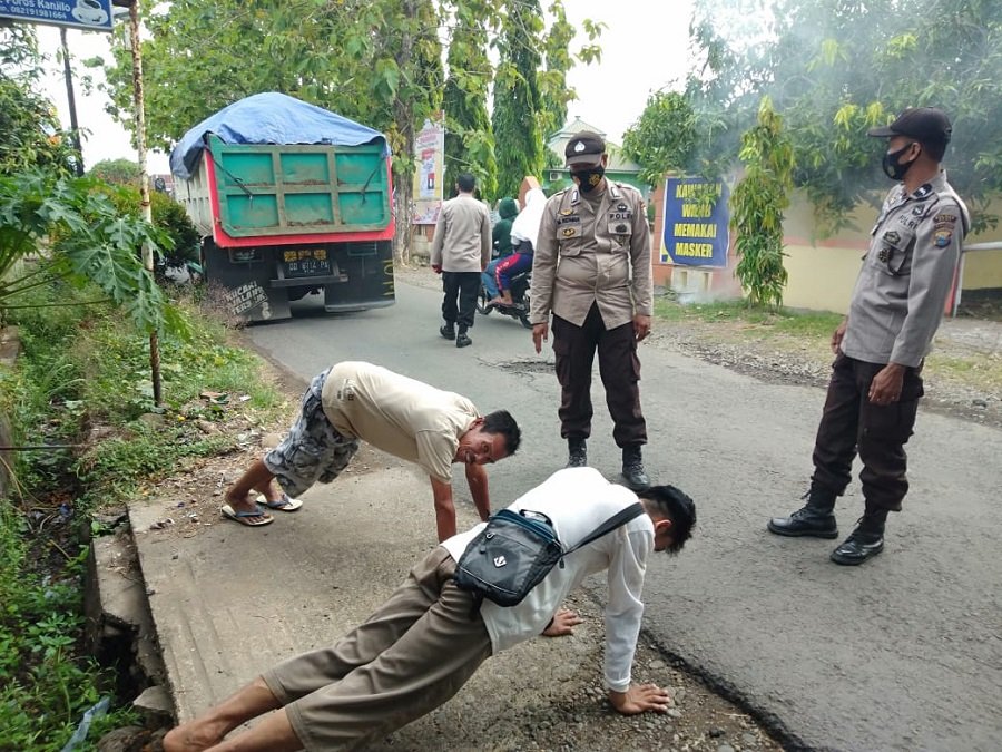 Nampak Ipda Haryana bersama anggota jaga memberikan edukasi pada Masyarakat serta juga teguran bagi warga pengendara RD. 2 /RD. 4 yang tidak patuhi Protokol kesehatan dan juga memberikan sangsi berupa hukuman fisik .