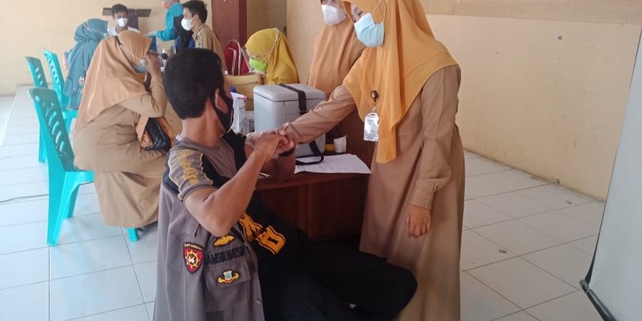 Wakapolsek Bajeng Polres Gowa Iptu Hamsir bersama Anggota Polsek Bajeng kembali melakukan Vaksinasi pencegahan Covid19, di selenggarakan oleh Puskesmas Bajeng yang di gelar di Aula Julukanaya Kantor Camat Bajeng Kab. Gowa, Selasa (30/3/2021) pagi.