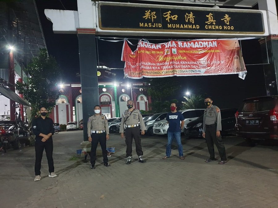 Guna memberikan rasa aman dan nyaman pada pelaksanaan ibadah Sholat Tarawih personil Gabungan Polres Gowa bersama Polsek Somba Opu gelar pengamanan di Mesjid Muhammad Cheng Hoo Jl. Tun Abd Razak Kabupaten Gowa, Jumat 16/04/2021 malam.