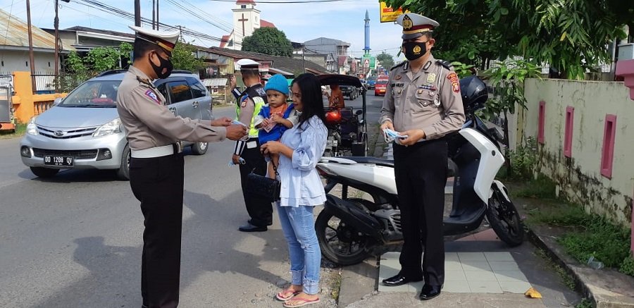 Warga pengguna jalan yang didapati melintas dan tidak pakai masker di berhentikan kemudian di himbau agar mengikuti Prokes setelah itu diberikan masker untuk dipakai dan berjanji tidak mengulangi kesalahan yang dilakukannya dan juga dihimbau agar tidak mudik selama pandemi ini. Jelas AKP Ronald.