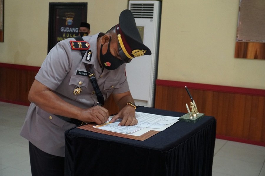 Sebagai bentuk pertanggungjawaban tugas selanjutnya IPTU Ahmadin di hadapan Kapolres Gowa dan seluruh pejabat utama melakukan penandatanganan berita acara pelantikan jabatan dan pengambilan sumpah jabatan sekaligus menandatangani pakta integritas.