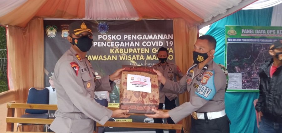 Wujud perhatian sekaligus sebagai penyemangat kepada seluruh personil pengamanan Kapolres Gowa menyerahkan bingkisan di pos pengamanan operasi ketupat 2021. (*erw).